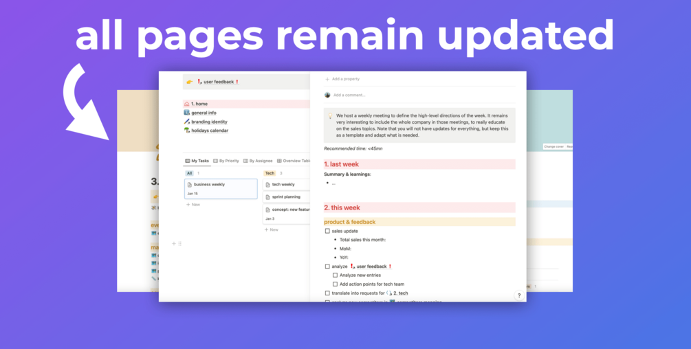 Over these 2 years, I've bought several Notion templates to boost the productivity of our team, but I was always frustrated. Pages are outdated very quickly, not tailored for tech startups, and everything had to happen through Notion, whereas it's clearly not an optimal tool for software TODOs for example... I had to review our organization every 3 months.